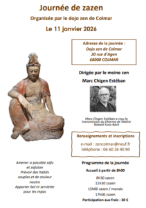 Le dojo zen de Colmar organise le 11 janvier 2026 une journée de zazen dirigée par Marc Chigen Estéban. Informations et contacts dans l’affiche ci-dessous.